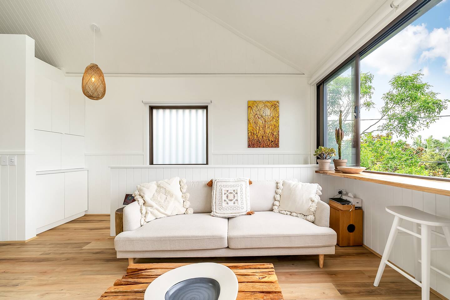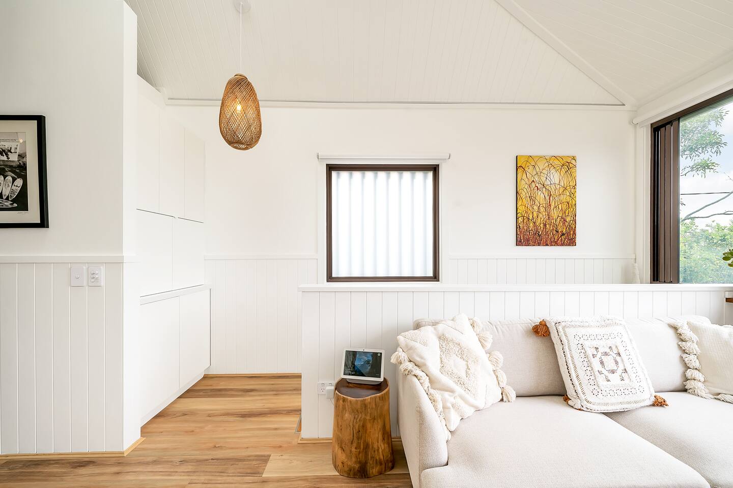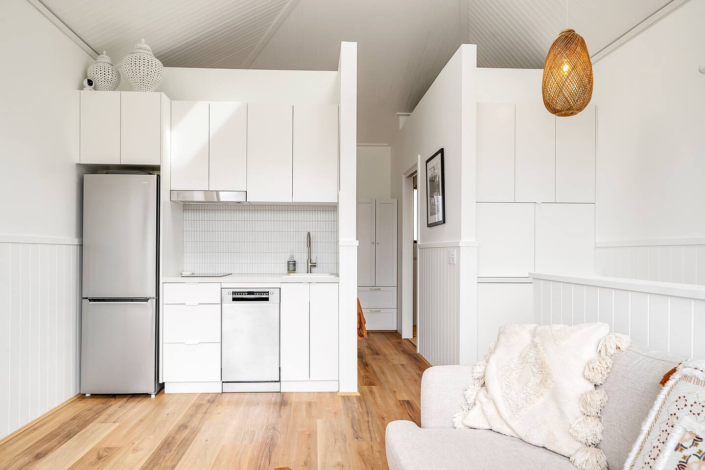 Avec de grandes fenêtres coulissantes donnant sur une rue arborée et paisible, ce superbe appartement d'une chambre dispose de tout ce dont vous avez besoin. Il est spacieux grâce à un magnifique plafond cathédrale et un puits de lumière qui rendent l'espace ouvert et lumineux. Inclus : • 1 chambre avec un lit queen size luxueux • Salle de bain attenante • Cuisine compacte avec réfrigérateur grande taille, lave-vaisselle, plaques de cuisson, micro-ondes, airfryer (mini-four - ils sont fabuleux) • Salon avec canapé confortable, Smart TV, bar pour le petit-déjeuner avec fenêtres donnant sur un jardin sur le toit et vue sur la rue • Buanderie (privée) avec machine à laver - accessible en bas par le garage • Ventilateur de plafond dans le salon (pas de climatisation, mais la brise marine rafraîchit lorsque les fenêtres sont ouvertes) • Beaucoup de places de stationnement dans la rue (permis fourni dans l'appartement) et stationnement illimité à 100 m.