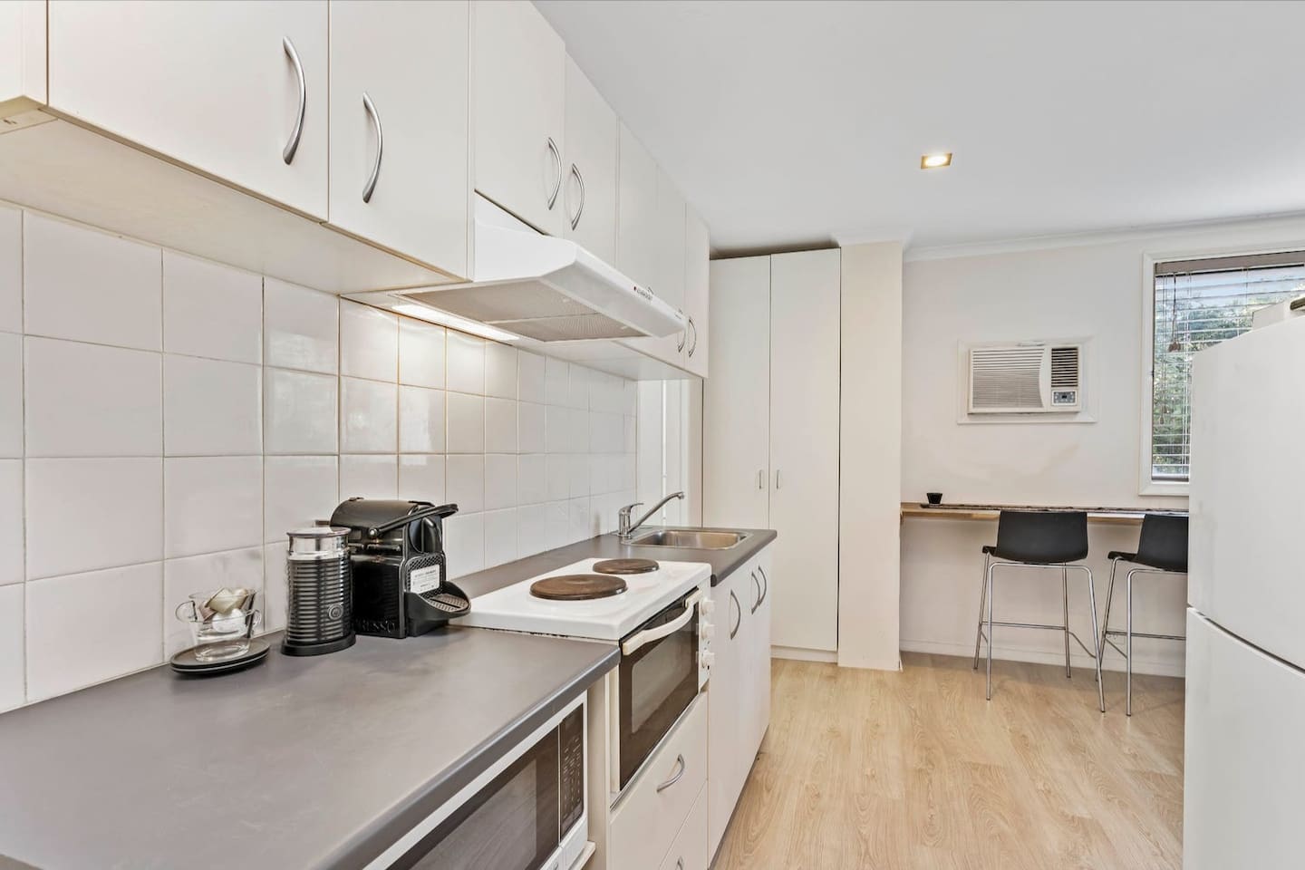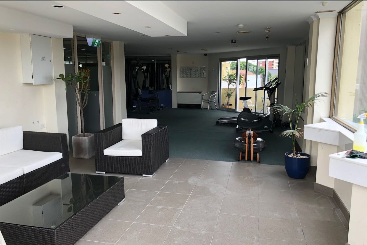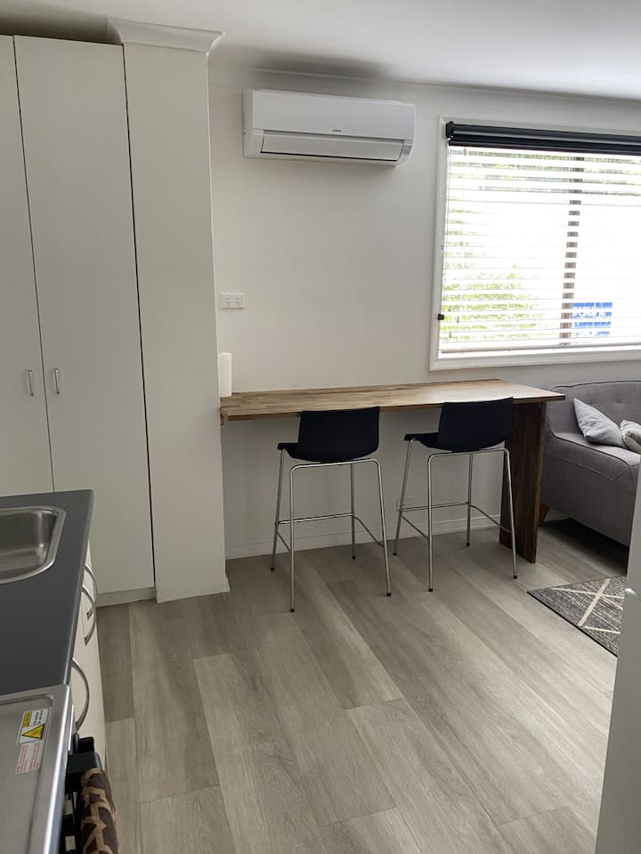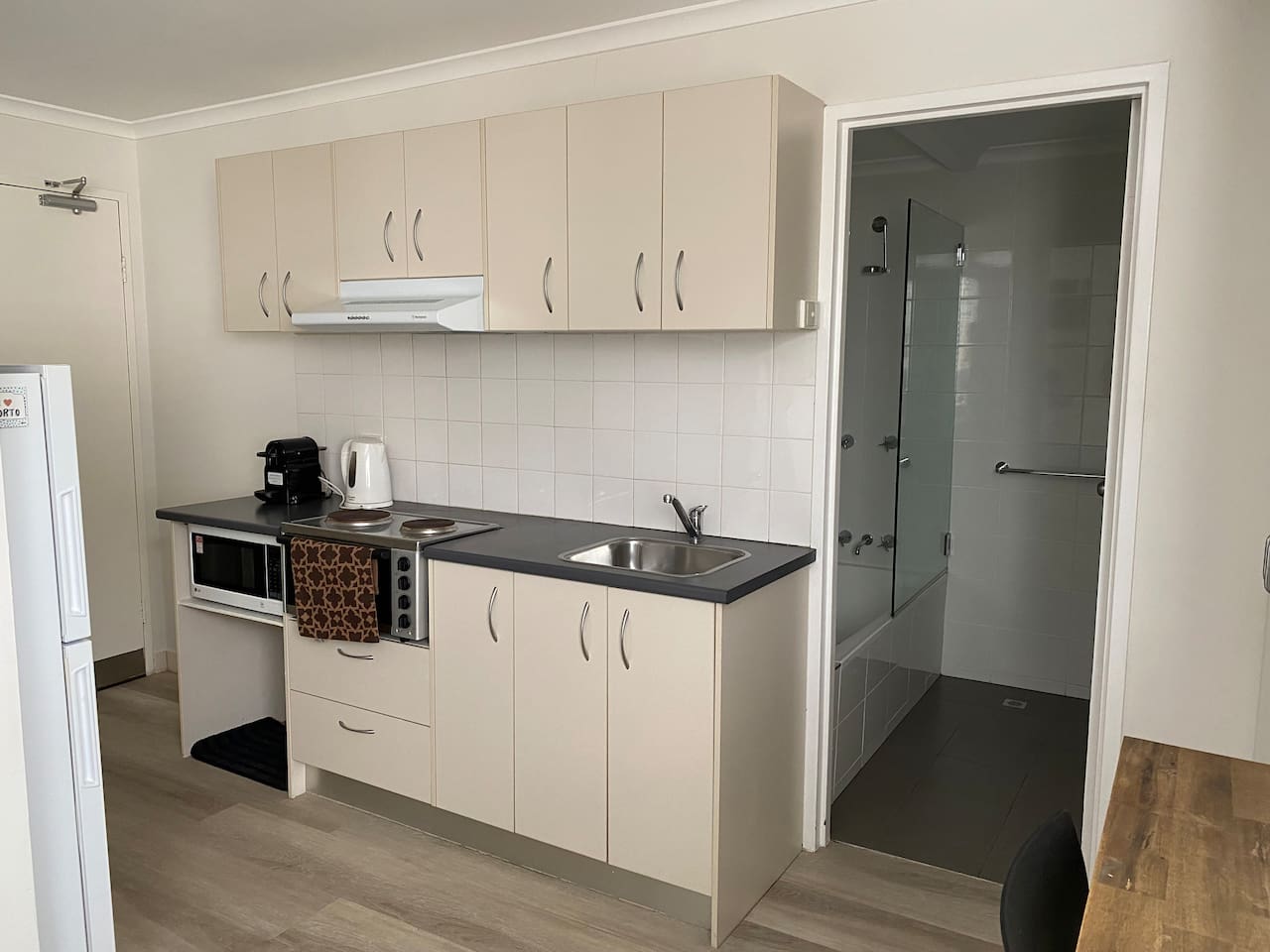 The studio includes: • Airconditioned • Kitchen with oven, microwave, and cooktop • Dining bench • Coffee machine • Full bathroom (shower over bath) • Full-sized refrigerator • High speed wi-fi • Shared laundry (paid) • Security building with lift • Free access to pool and gym